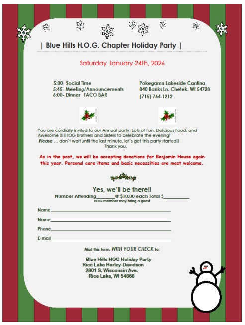 Please fill out a copy of the form below and return back to us, with your payment, by January 10, 2026 OR as soon as possible, so we can order the proper amount of yummy food!!! Forms are also available at the Rice Lake Harley Davidson Dealership, and are handed out at our Chapter Meetings. Filled out forms and payment (cash or check, made out to Blue Hills HOG) can be sent to or dropped off at the Dealership.
